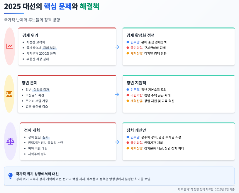 - 2025 대선은 경제, 미래산업, 청년, 복지, 정치개혁 등 다양한 분야에서 실질적 변화를 요구하는 선거입니다.
