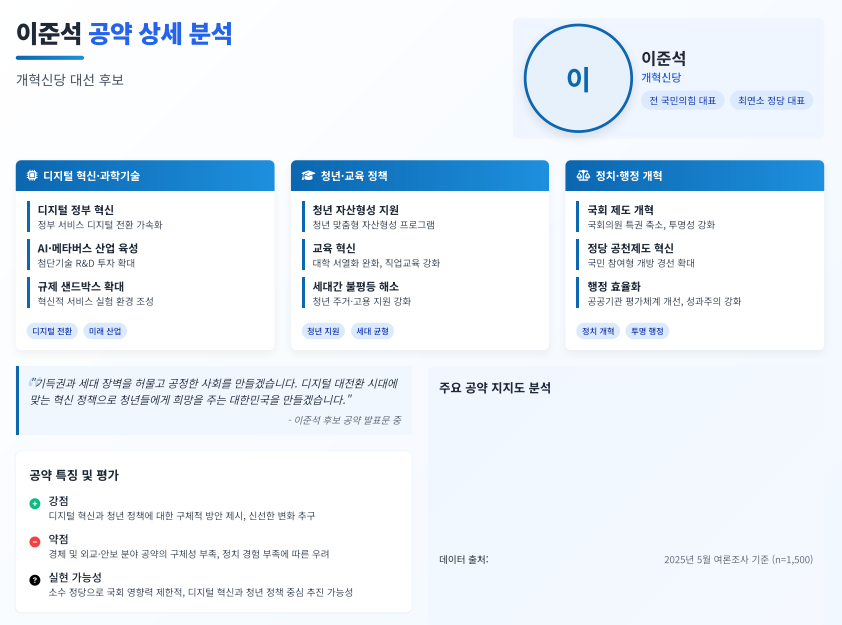 - 이준석(개혁신당) : 정부조직 혁신, 디지털 전환, 청년 창업·주거 등 미래지향적 개혁 정책에 집중. 젊은 층과 변화에 민감한 유권자들의 지지.